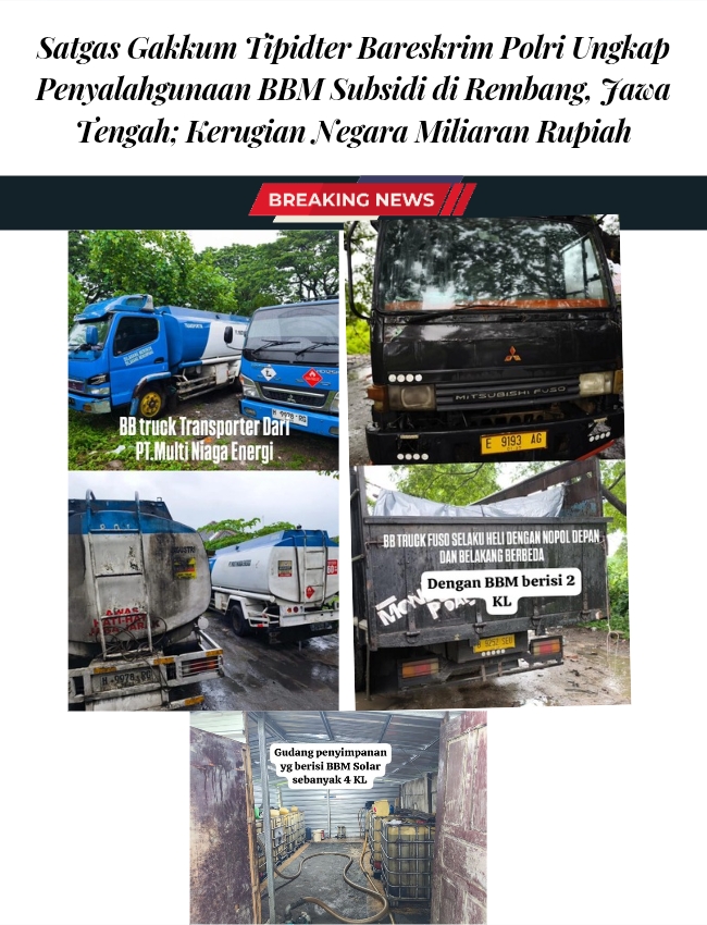 Rembang, Jawa Tengah – Tim Satgas Gakkum Tindak Pidana Tertentu (Tipidter) Bareskrim Polri berhasil mengungkap kasus penyalahgunaan Bahan Bakar Minyak (BBM) solar bersubsidi di Kabupaten Rembang, Jawa Tengah. Pengungkapan kasus yang dipimpin langsung oleh Katim 1 subsatgas 2, Kompol Wediard Fernandes, S.H., S.I.K., M.H., dibantu oleh Sat Reskrim Polres Rembang ini dilakukan pada Senin, 10 Maret 2025, dan mengungkap modus operandi yang sistematis serta merugikan negara hingga miliaran rupiah.