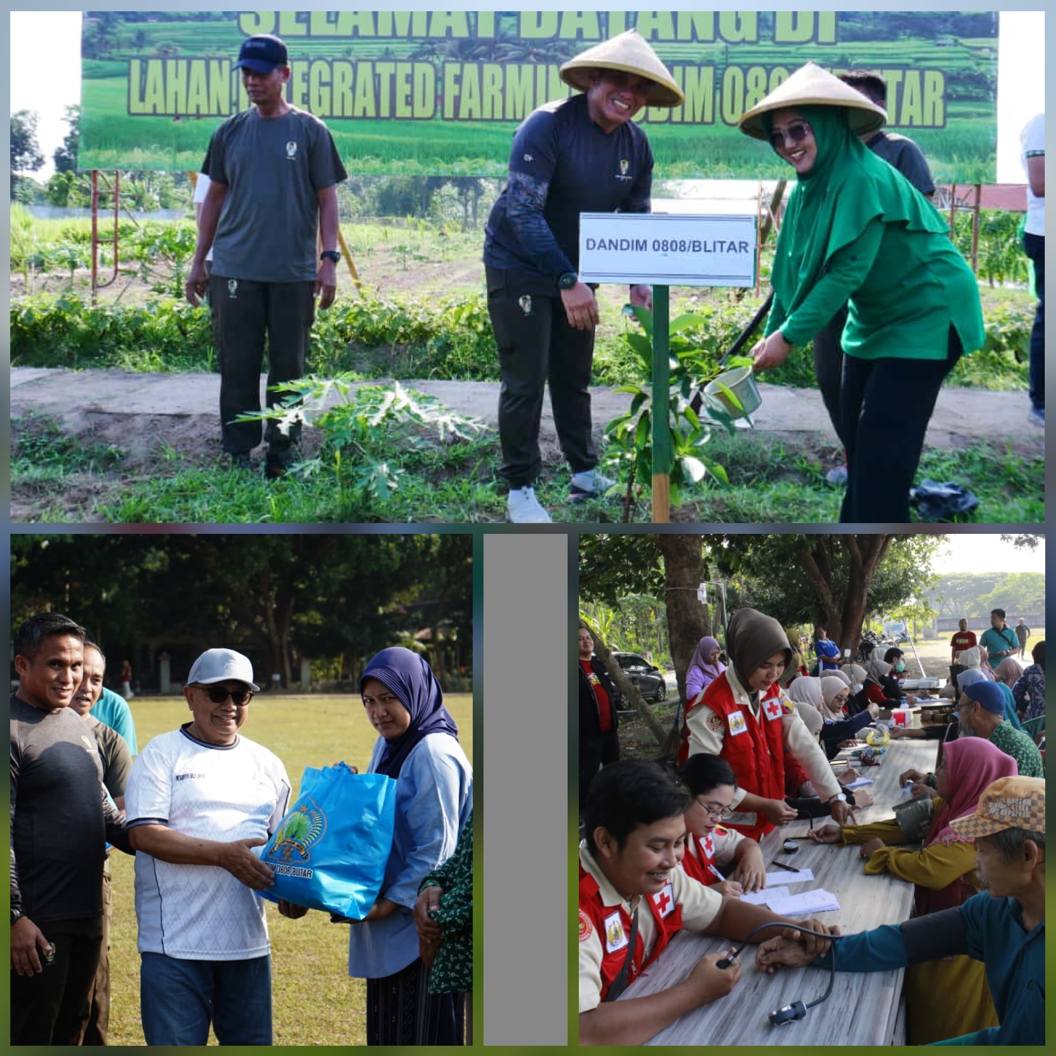 Rangkaian kegiatan dilanjutkan dengan penyerahan bantuan sosial kepada masyarakat kurang mampu, pelaksanaan senam bersama Forkopimda dan anggota Kodim 0808/Blitar, pemeriksaan kesehatan gratis, serta penanaman pohon secara simbolis oleh Forkopimda. Tak ketinggalan, rombongan juga meninjau langsung lahan ketahanan pangan milik Kodim 0808/Blitar.