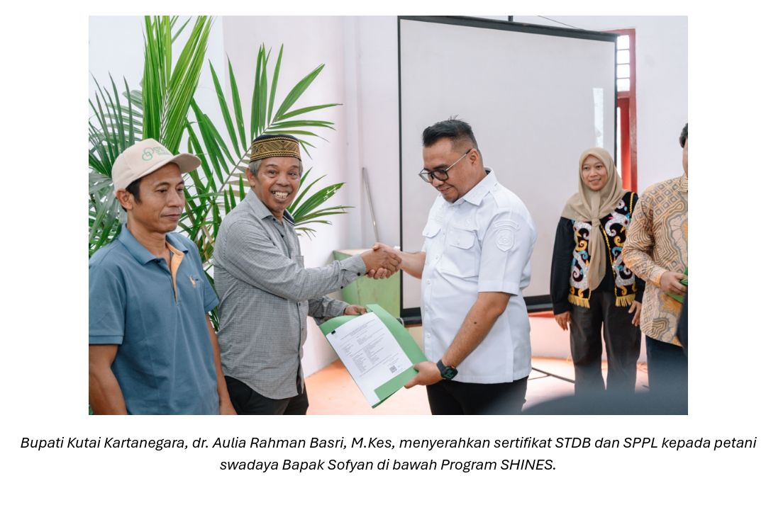 Bupati Kutai Kartanegara, dr. Aulia Rahman Basri, M.Kes, menyerahkan sertifikat STDB dan SPPL kepada petani swadaya Bapak Sofyan di bawah Program SHINES.