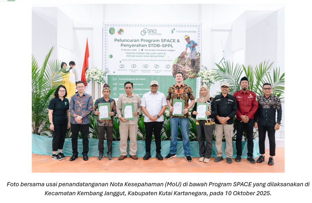 Kutai Kartanegara, Kalimantan Timur, , 10 Oktober 2025 — PT REA KALTIM PLANTATIONS (REA) menandai tonggak penting dalam komitmennya terhadap produksi sawit yang inklusif dan berkelanjutan melalui peluncuran resmi Program Smallholder Partnership AcCEleration (SPACE) serta penyerahan sertifikat STDB (Surat Tanda Daftar Budidaya) dan SPPL (Surat Pernyataan Pengelolaan Lingkungan) bagi petani swadaya di bawah Program SmallHolder Inclusion for Ethical Sourcing (SHINES).