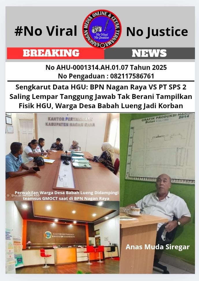 Nagan Raya, Aceh (GMOCT) 12 Oktober 2025 – Polemik terkait keterbukaan informasi Hak Guna Usaha (HGU) kembali mencuat di Nagan Raya, Aceh, setelah PT SPS 2 Agrina dan Badan Pertanahan Nasional (BPN) setempat terlibat saling lempar tanggung jawab untuk memperlihatkan bukti fisik ijin HGU yang diklaim oleh PT SPS 2 Agrina untuk dijadikan dasar melaporkan dua warga Desa Babah Lueng. Konflik ini berdampak langsung pada warga Desa Babah Lueng yang kini terancam kriminalisasi.