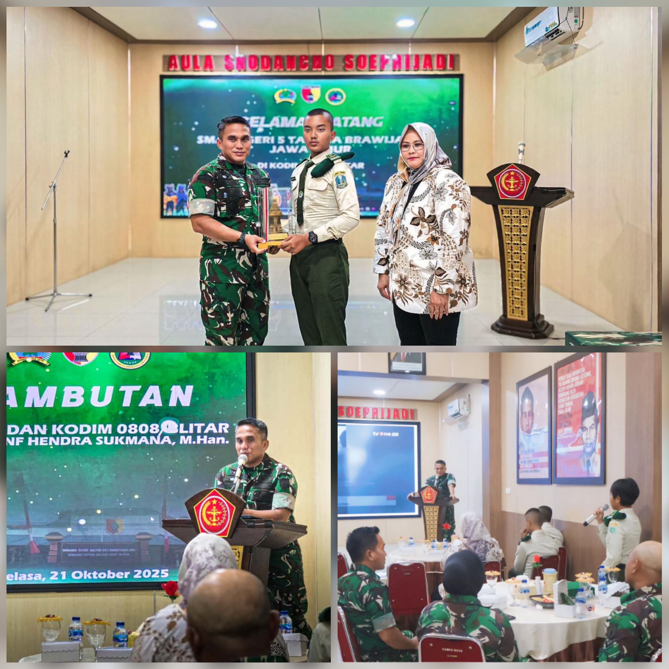Blitar – Bertempat di Aula Shodancho Soeprijadi Kodim 0808 Blitar, Jl. A. Yani No. 06 Kelurahan Kepanjenkidul Kota Blitar, telah dilaksanakan kegiatan pengarahan oleh Komandan Kodim 0808/Blitar Letkol Inf Hendra Sukmana, M.Han kepada siswa SMA Negeri 5 Taruna Brawijaya, Selasa (21/10/2025). Kegiatan tersebut diikuti sekitar 25 siswa Taruna dan berlangsung dalam suasana penuh semangat dan kekeluargaan.