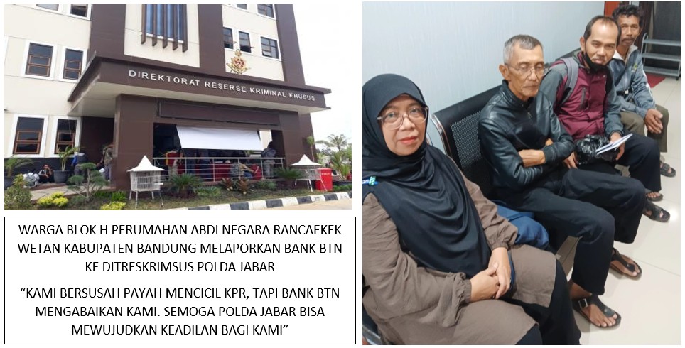 Jawa Barat, _ Warga blok H perumahan Abdi Negara Desa Rancaekek Wetan Kecamatan Rancaekek Kabupaten Bandung telah mengadukan Bank BTN ke Ditreskrimsus Polda Jawa Barat karena cicilan KPRnya sudah lunas, tapi Bank BTN tidak menyerahkan sertifikat rumahnya.