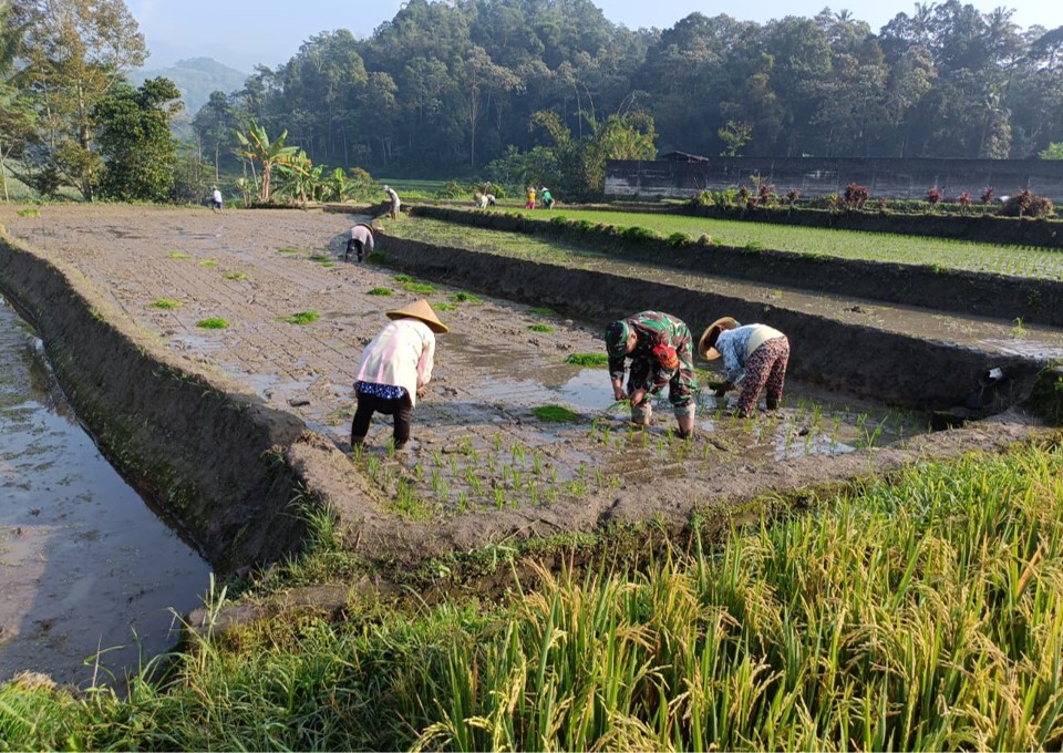 Kegiatan tanam padi kali ini dilakukan dengan metode tradisional atau yang akrab disapa oleh masyarakat setempat dengan istilah tandur (tanam mundur). Meskipun teknologi pertanian terus berkembang, metode tradisional ini dinilai masih efektif untuk menjaga presisi jarak tanam di lahan tertentu. Pelda Slamet nampak antusias berbaur dengan petani, menyusuri lumpur sawah demi memastikan bibit padi tertanam dengan baik.
