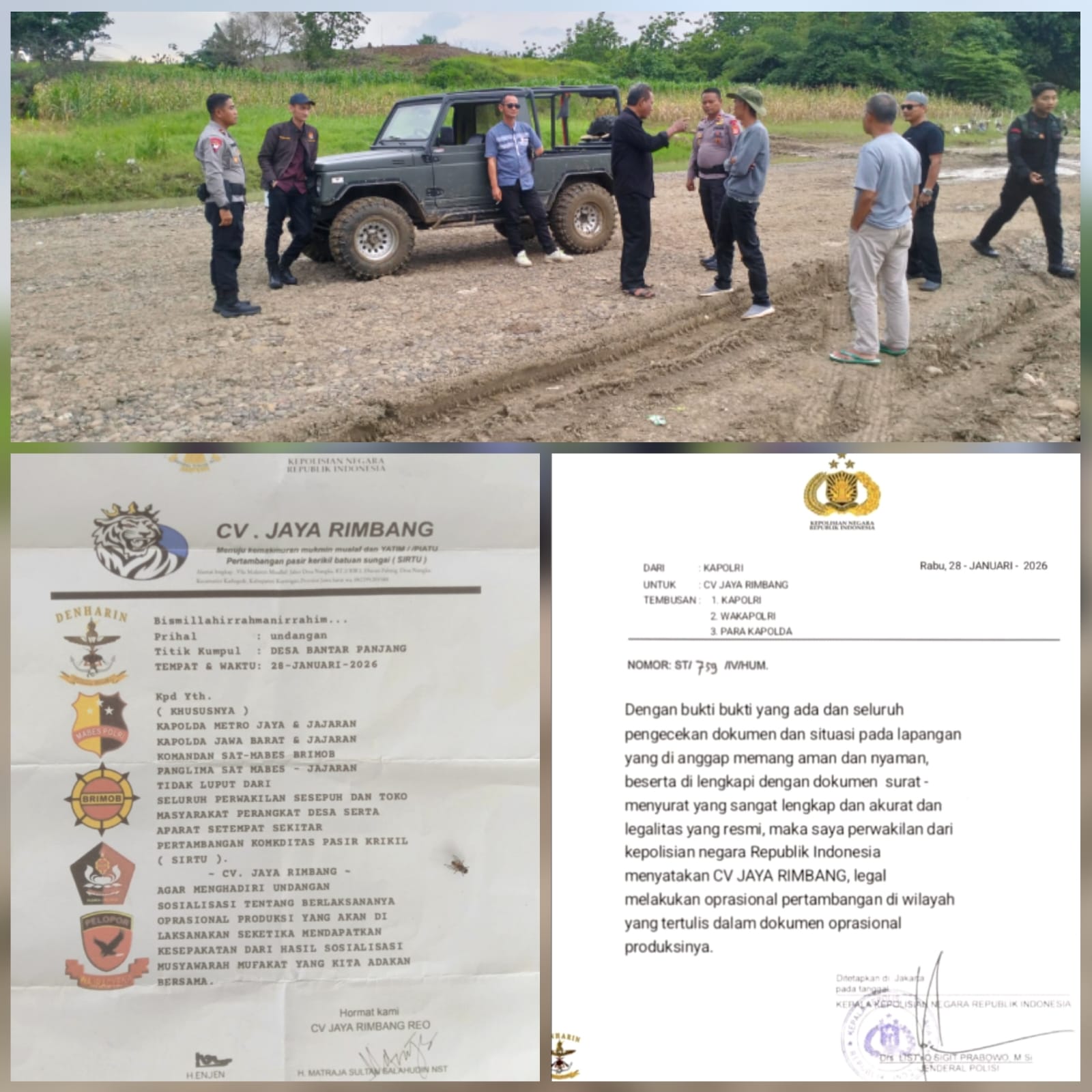 Dalam surat tertanggal 28 Januari 2026 itu tercantum sejumlah logo dan nama satuan seperti DENHARIN, MABES POLRI, BRIMOB, dan PELOPOR. Kegiatan sosialisasi tersebut disebut dilaksanakan oleh CV Jaya Rimbang.